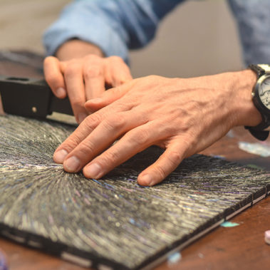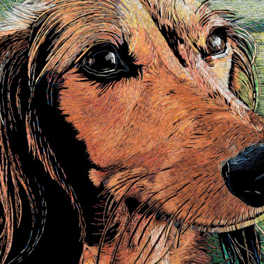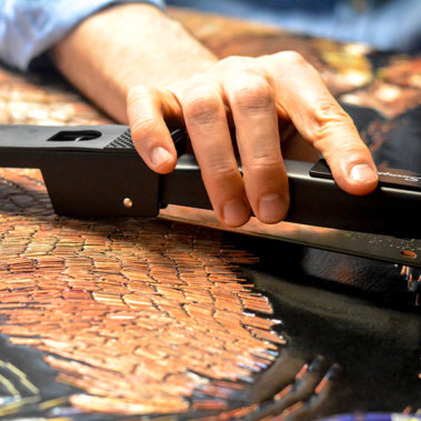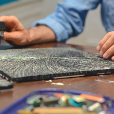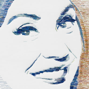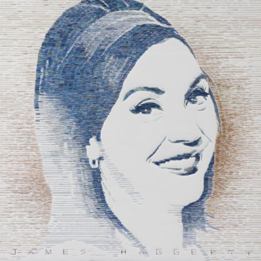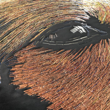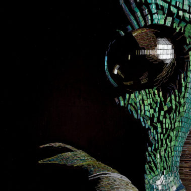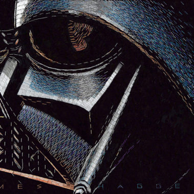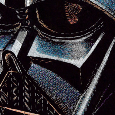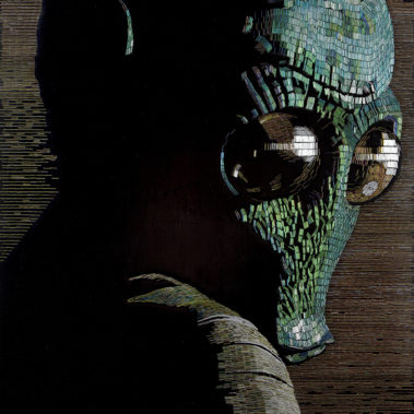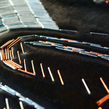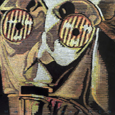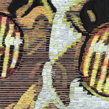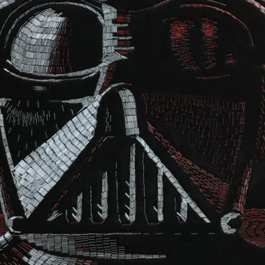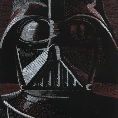 My fourth mosaic was yet another in my Star Wars series and another iteration image of the iconic Darth Vader character, called simply, Darth. I am constantly searching for new colored staples to expand my palette and I buy several thousand at one time. By the time I began work on Darth, I amassed a large collection. It was great to be able to use so many cool colors such as cyan, light blue and violet on Vader’s mask, especially on the helmet at the top of the piece.