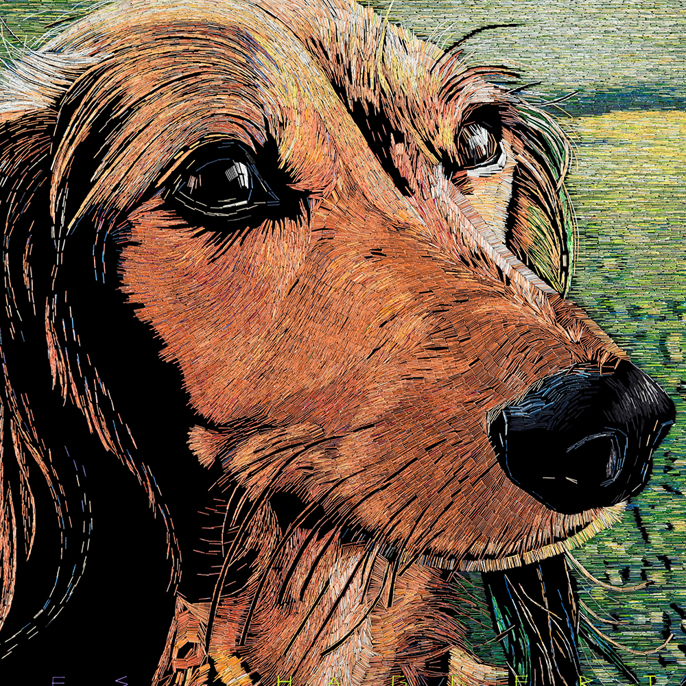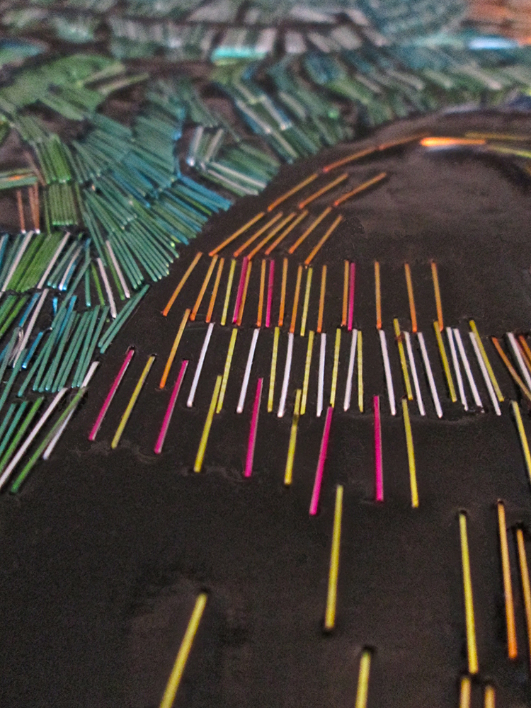 My fourth mosaic was yet another in my Star Wars series and another iteration image of the iconic Darth Vader character, called simply, Darth. I am constantly searching for new colored staples to expand my palette and I buy several thousand at one time. By the time I began work on Darth, I amassed a large collection. It was great to be able to use so many cool colors such as cyan, light blue and violet on Vader’s mask, especially on the helmet at the top of the piece.