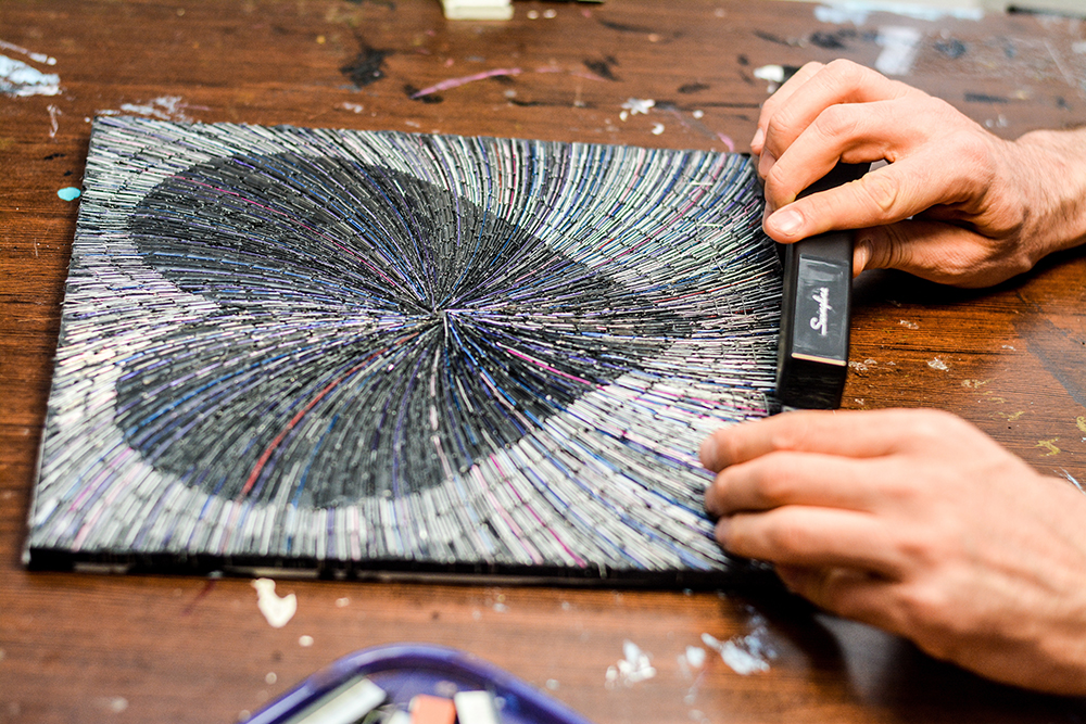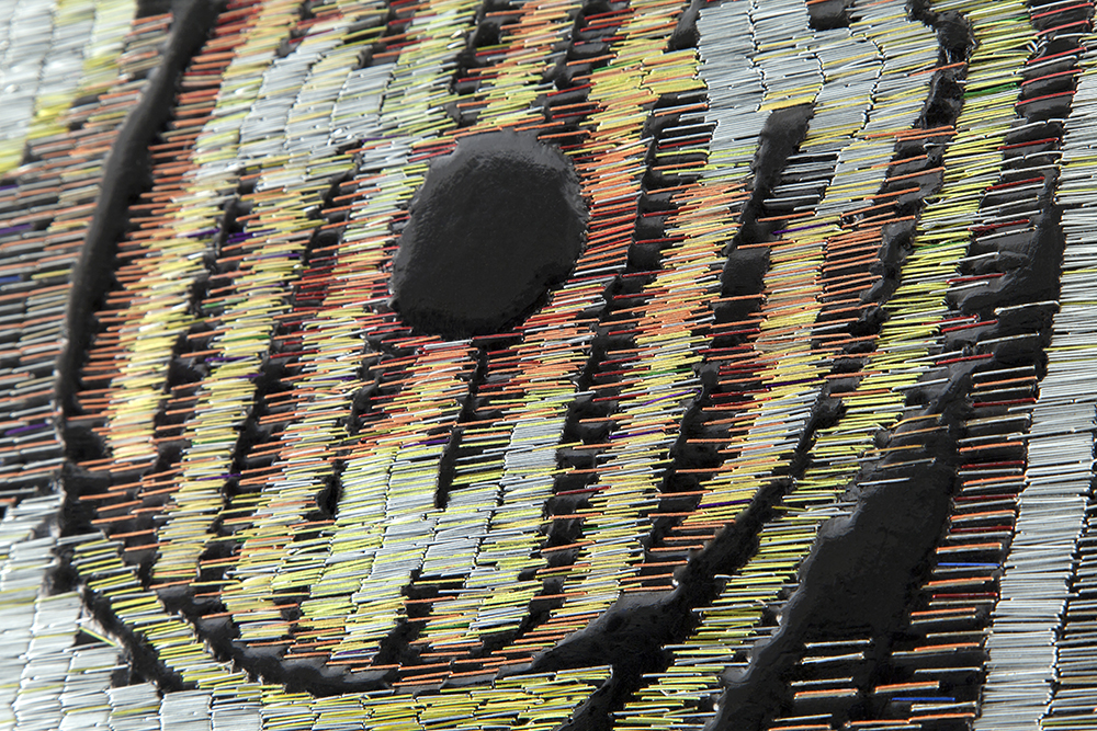 12,352 multi-colored staples on a 25″ x 40″ painted board.